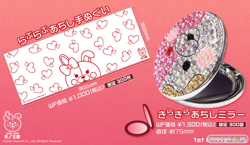 ■ 商品名:「モノミ屋 らぶらぶあちし手ぬぐい」 ■ 発売元:株式会社アルジャーノンプロダクト ■ 仕様:手ぬぐい 特岡 ■ 素材:綿(日本製) ■ 会場特別価格:税込1,000円 限定300個 |