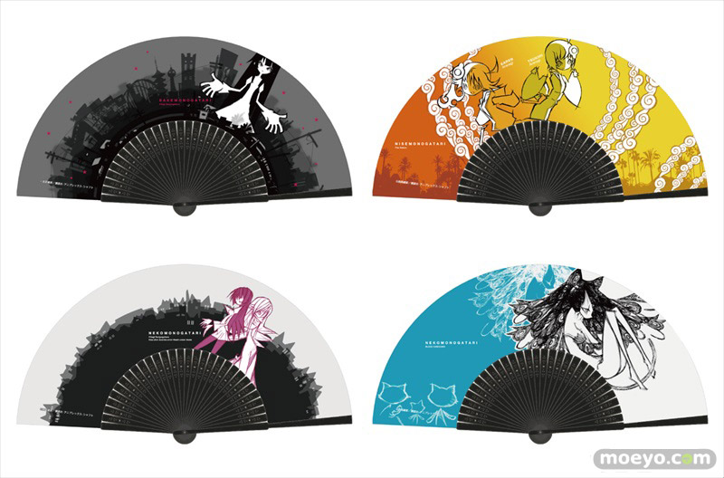 ■ 商品名:「化物語 布扇子」「偽物語 布扇子」「猫物語 布扇子 壱」「猫物語 布扇子 弐」 ■ 発売元:合同会社ゼクストワークス ■ 仕様:PVC塗装済完成品 ■ サイズ:約210mm ■ 素材:生地部分⇒ポリエステル 骨部分⇒竹 ■ 価格:各税込1,600円 |