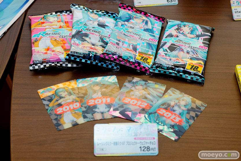 【内容】初音ミクとコラボレーションしたウェファーチョコの第4弾。今回は、“レーシングミク”となった初音ミクがイメージキャラクターを務める、レーシングチーム「グッドスマイルレーシング」とのタッグで生まれたオリジナルデザインです。歴代のレーシングミクを贄沢にあしらった全18種類。パッケージデザイン全4種。数量限定。