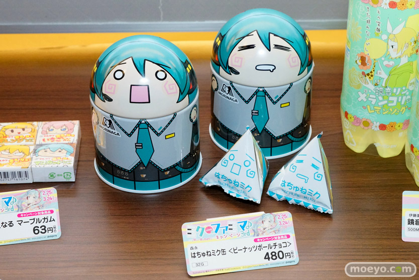 「初音ミクまるくなるマーブルガム」(税込価格:63円)や、「鏡音リンメランコリックレモンソーダ」(税込価格:147円)など人気楽曲をイメージしたものや、「レーシングミク~初音ミクGTプロジエクトウエフアーチョコ」(税込価格:128円)や、「はちゅねミク缶<ピーナッツボールチョコ>」(税込価格:480円)など個性豊かな8種類のコラボレーシヨン商品で2月25日(火)から発売します。