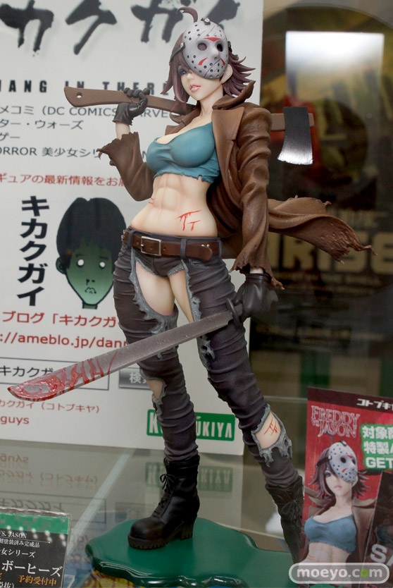 山下しゅんや氏の描き下ろしイラストを毒島孝牧氏が立体化するコトブキヤの新作フィギュア「HORROR美少女 フレディVSジェイソン ジェイソン・ボーヒーズ」の彩色サンプルが、コトブキヤ秋葉原店で展示!『斜めに被ったホッケーマスは勿論、ジェイソンのパワフルさを彷彿とさせる力強い佇まいや割れた腹筋に注目です!』というもので、製品版では両手の持った斧と鉈は取り外し可能。そんなサンプル展示の様子を特集でお伝えします!