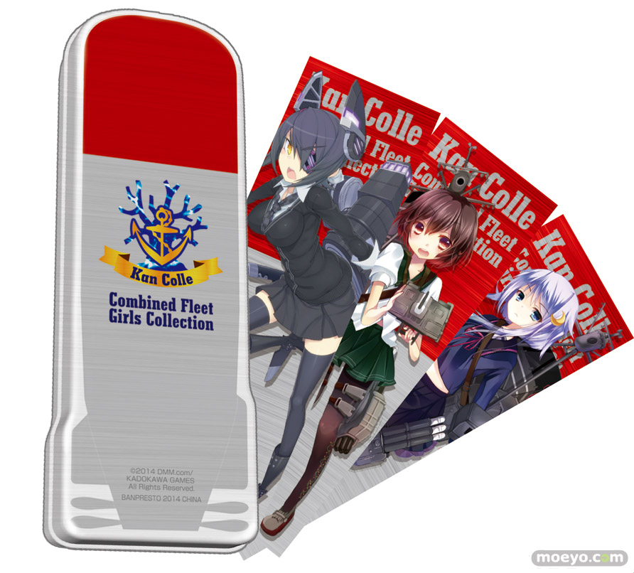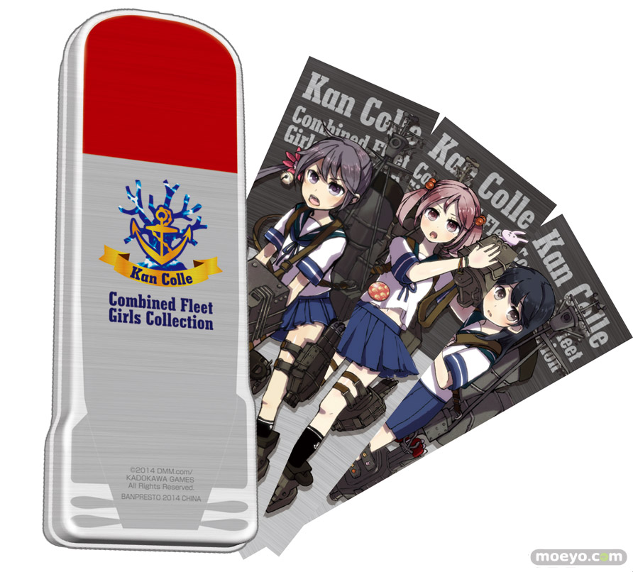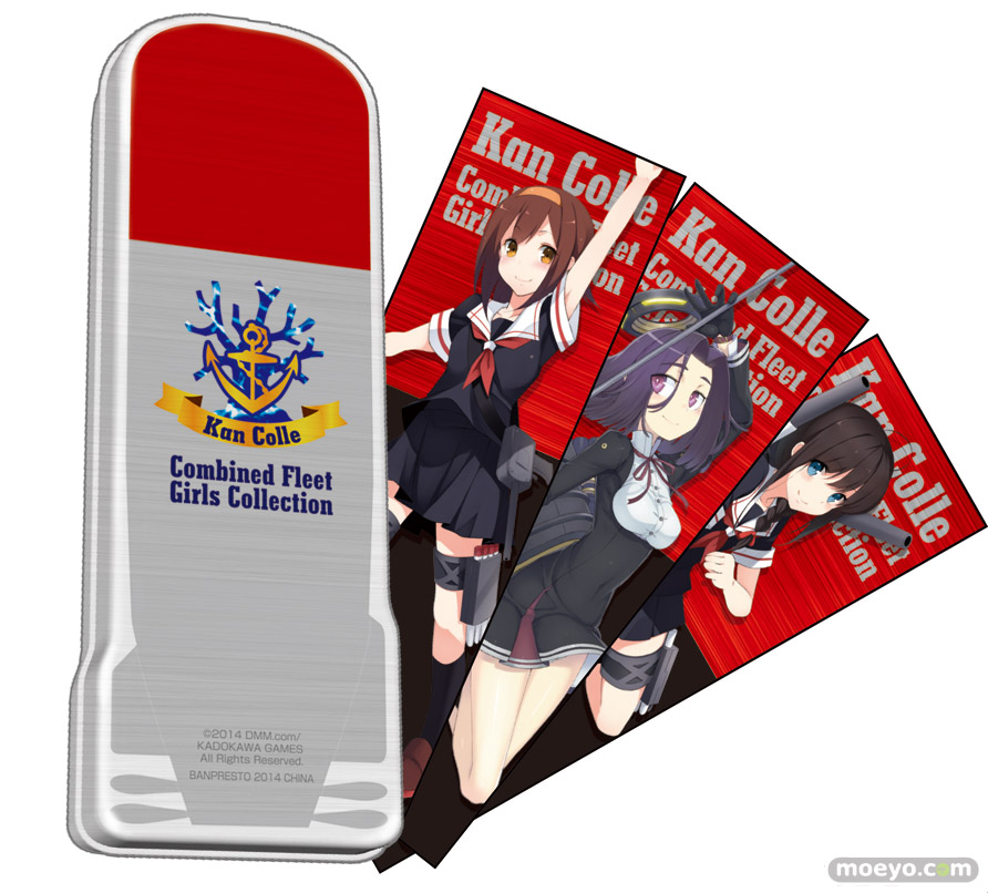 魚雷をモチーフにした缶ケースと、「艦娘」たちを描いたしおりのセットです。