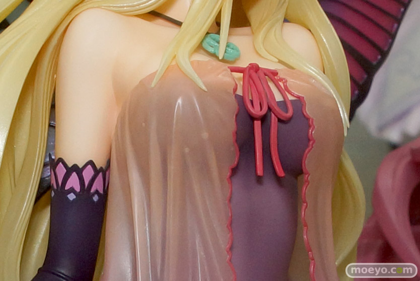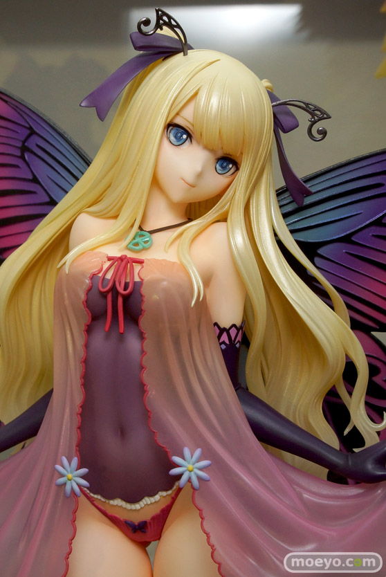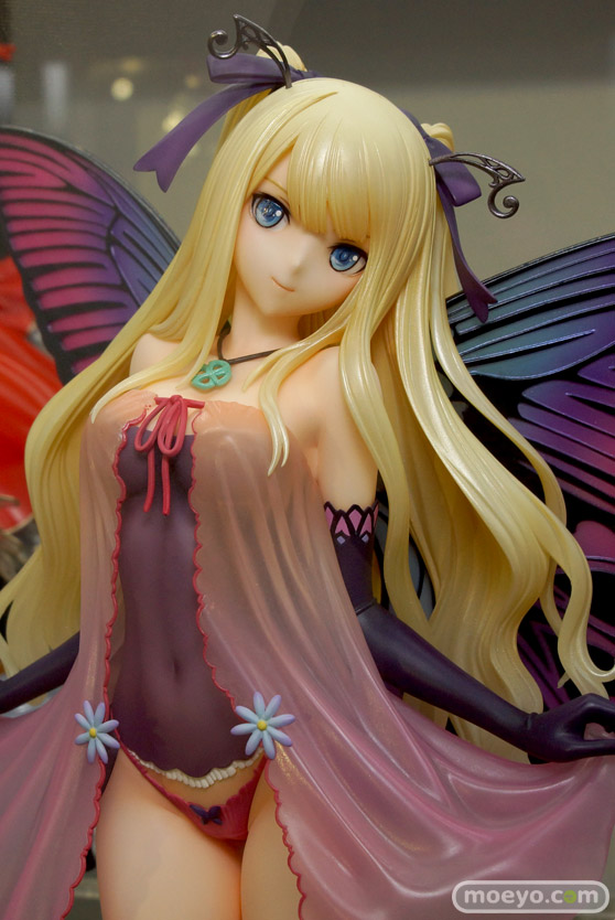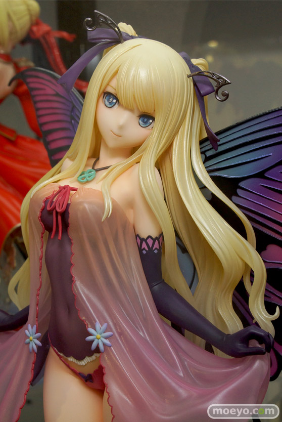 イラストや設定で透過表現されているドレスやブーツなどの衣装はもちろん、大きな特徴でもある蝶の翅など、クリア素材に塗装する事による質感を再現。特にブロンドの髪は透過感を残した塗装により柔らかく軽やかに表現しました。