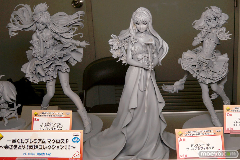 【宮沢展示会34】「一番くじプレミアム マクロスF~春さきどり!歌姫コレクション!!~」 A・B・C賞プレミアムフィギュア&きゅんキャラの製作途中原型画像レビュー 2015年3月28日(土)より、ファミリーマート、ホビーショップなどで順次発売予定の「一番くじプレミアム マクロスF~春さきどり!歌姫コレクション!!~」!画像の「A賞 ドレスシェリル」や「B賞 シェリル」「C賞 ランカ」のプレミアムフィギュアと、I賞のきゅんキャラの製作途中原型が、11月18日に開催された「宮沢模型 第34回 商売繁盛セール」の会場で公開!その様子を画像レビューとしてお伝えします!