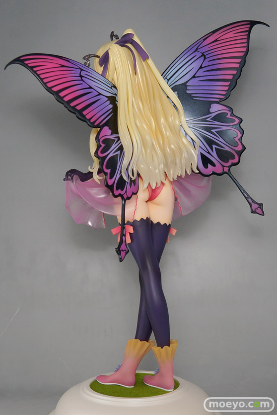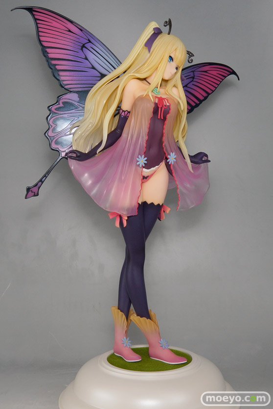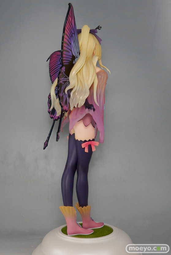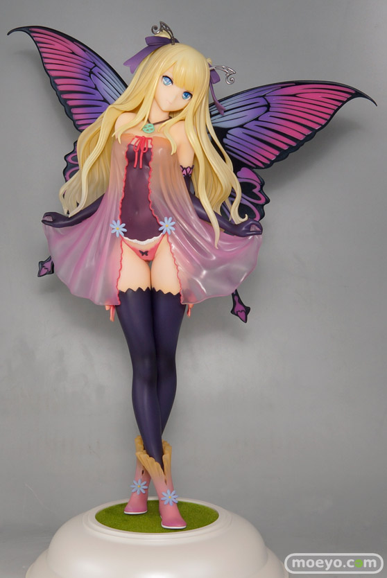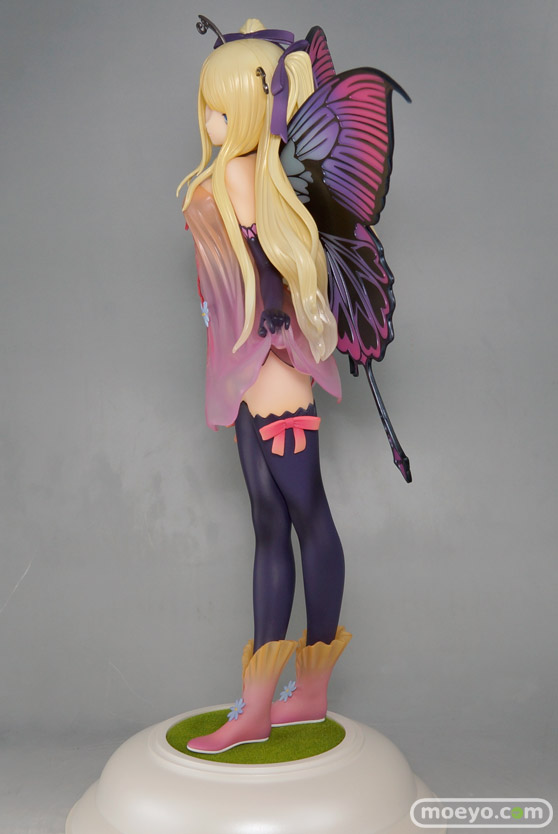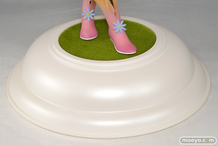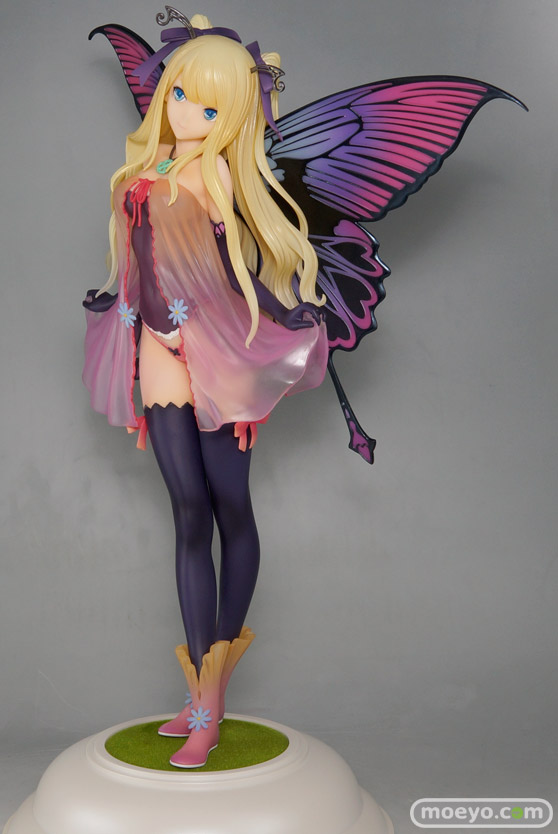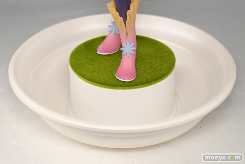 イラストや設定で透過表現されているドレスやブーツなどの衣装はもちろん、大きな特徴でもある蝶の翅など、クリア素材に塗装する事による質感を再現。特にブロンドの髪は透過感を残した塗装により柔らかく軽やかに表現しました。ベースは外縁パーツを裏返すと受け皿状になるというデイジーと同仕様のもので、市販の造花等を使用して