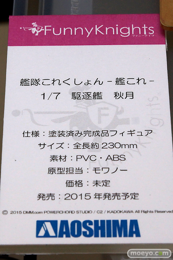 【宮沢展示会35】ファニーナイツ「艦隊これくしょん-艦これ- 1/7  駆逐艦 秋月」 新作フィギュア原型画像レビューアオシマのフィギュアブランド「ファニーナイツ」の新作フィギュア「艦隊これくしょん-艦これ-1/7 駆逐艦 秋月」の監修中原型が、「宮沢模型 第35回 商売繁盛セール」で公開!右手の指を突き出した、凛々しくもかわいらしく、ちょっとだけ色っぽいポーズでの立体化で、原型制作は現在予約中の「加賀」(画像レビュー)同様、モワノー氏が担当。その展示の様子を、画像レビューとしてお伝えします!