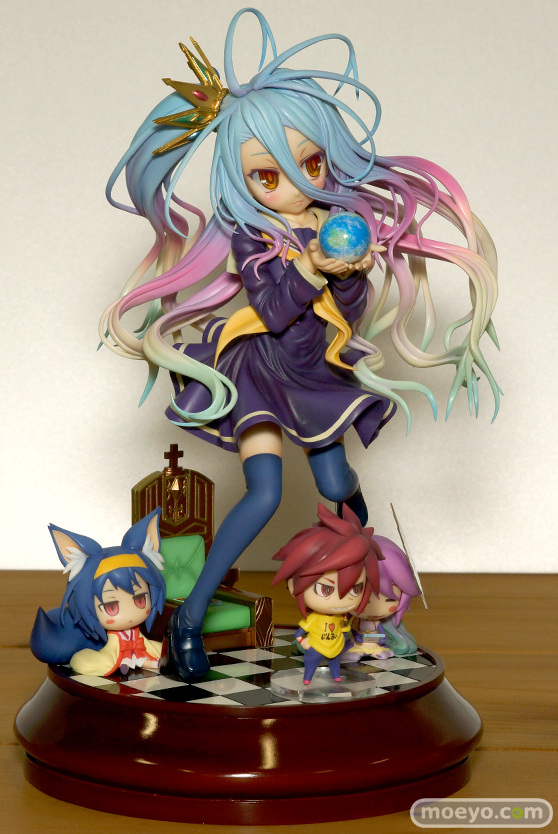 TVアニメ『ノーゲーム・ノーライフ』より、主人公であるゲーマー兄妹『 』(くうはく)の一人・「白」を1/7スケールで立体化。イラストの独創的なタッチ・色使いを造形、彩色に至るまで細やかに表現致しました。また、チェス盤を模した台座や人類種の玉座、デフォルメされた空、いづな、ジブリール、ステフも付属し、凝縮されたノーゲーム・ノーライフの世界を楽しめる一品となっております。