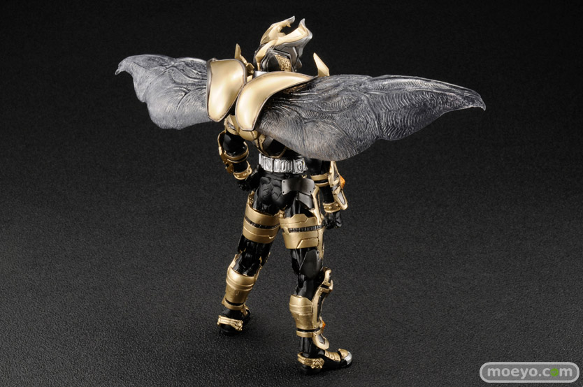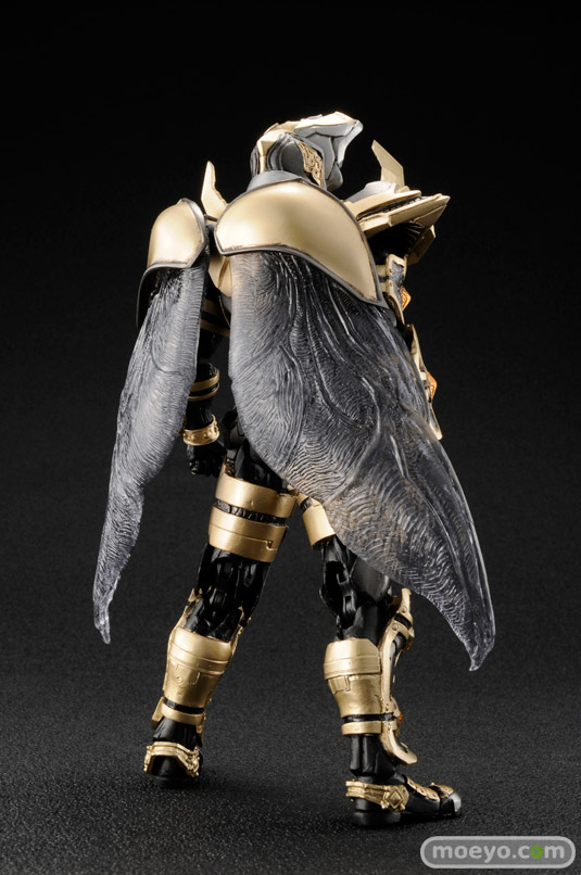 玩具オリジナル超ボリュームの武器、重醒銃キングラウザーや、マントを思わせる巨大な羽パーツなどのギミック、各関節部の一新など、TVシリーズ放映から10年の時を超えて商品化されるに相応しいクオリティの製品となった「仮面ライダーギャレン キングフォーム」。