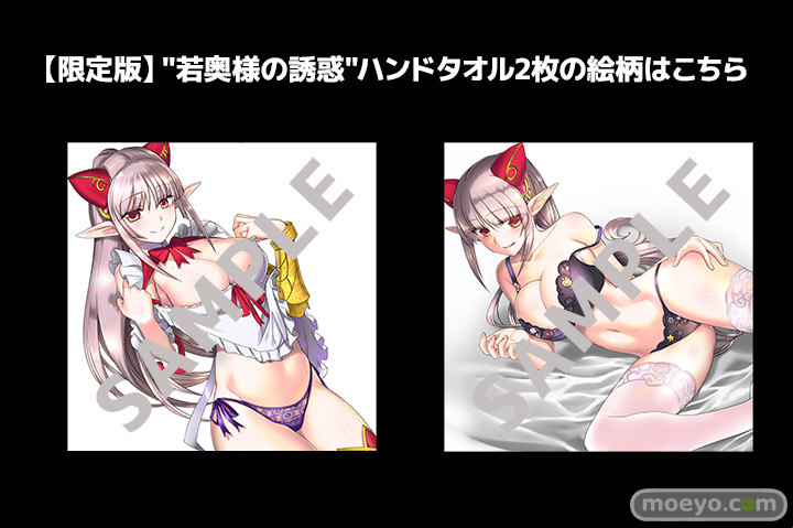 そして期待の限定版には、かんたか氏描きおろしイラストを使用した25cm角”若奥様の誘惑”フルカラーハンドタオルが何と2枚も付属!イラストを美しく再現したカラープリント面と柔らかなタオル面の両面構造で使い勝手も抜群です。