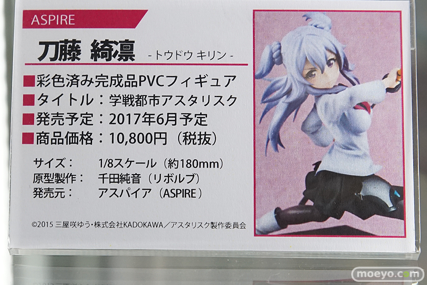 アスパイアの新作フィギュア「学戦都市アスタリスク 刀藤綺凛」の彩色サンプルが、あみあみ秋葉原店で予約開始前に先行展示!『愛刀「千羽切」を鞘から抜いて迎撃しているような瞬間を1/8スケールで立体化いたしました。』というもので、原型制作は千田純音さん。彩色制作は森山奈菜さん(ともにリボルブ)。その展示の様子を画像レビューとしてお伝えします!