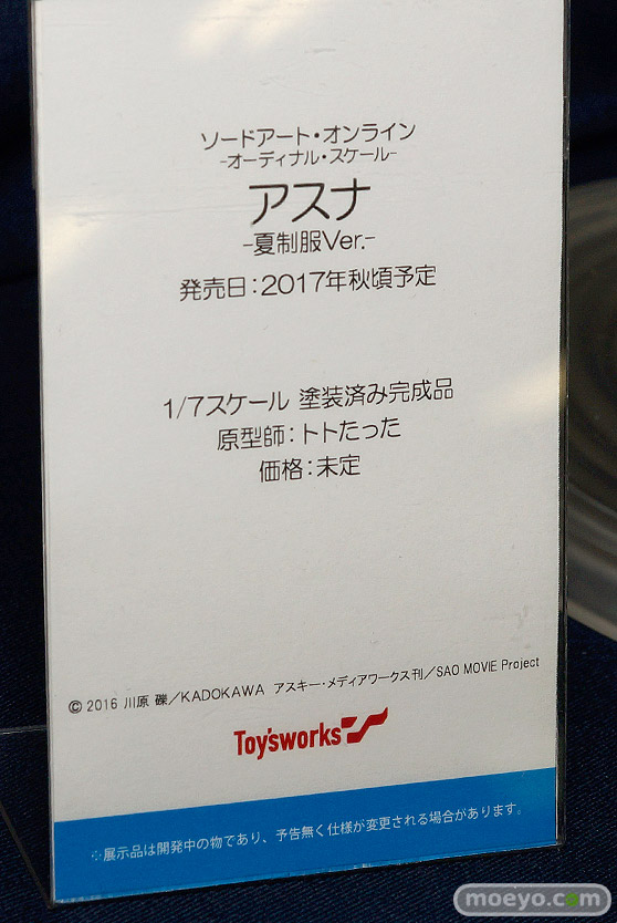 トイズワークス新作フィギュア「ソードアート・オンライン -オーディナル・スケール- アスナ -夏制服Ver.-」監修中原型が展示!【宮沢展示会39】トイズワークスの新作フィギュア「ソードアート・オンライン -オーディナル・スケール- アスナ -夏制服Ver.-」の監修中原型が展示!タイトル通り夏制服姿での立体化で、原型制作はトトたったさん。POPによると2017年秋頃予定とのこと!その展示の様子を画像レビューとしてお伝えします!