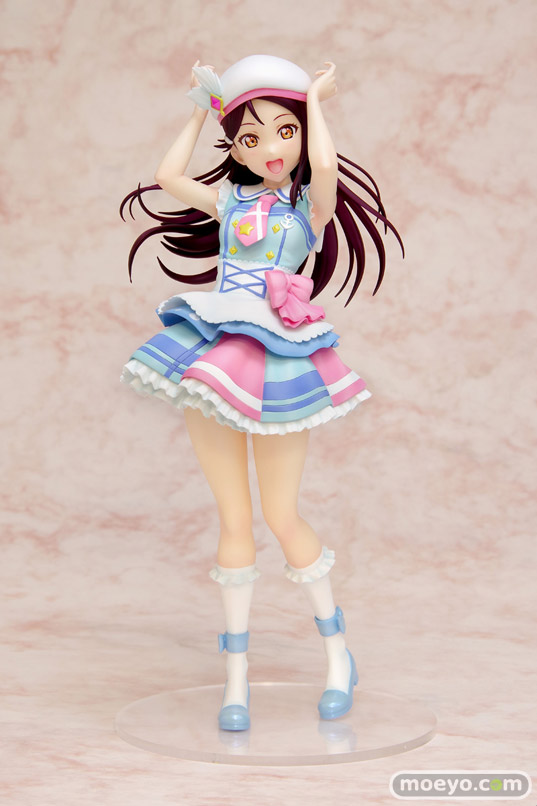 衣装は、胸元のイカリマークなど、Aqoursらしくマリンテイストのデザイン。各所のキラキラしたアクセサリーに加え、ブローチが輝く白いベレー帽がキュートです。 実は慌てん坊なところもある梨子が、愛らしく帽子を軽くおさえたポージングで造形されています。首部分にはネックジョイント【H】規格を搭載しており、可動させることで微妙なしぐさの変化を楽しむことができます。