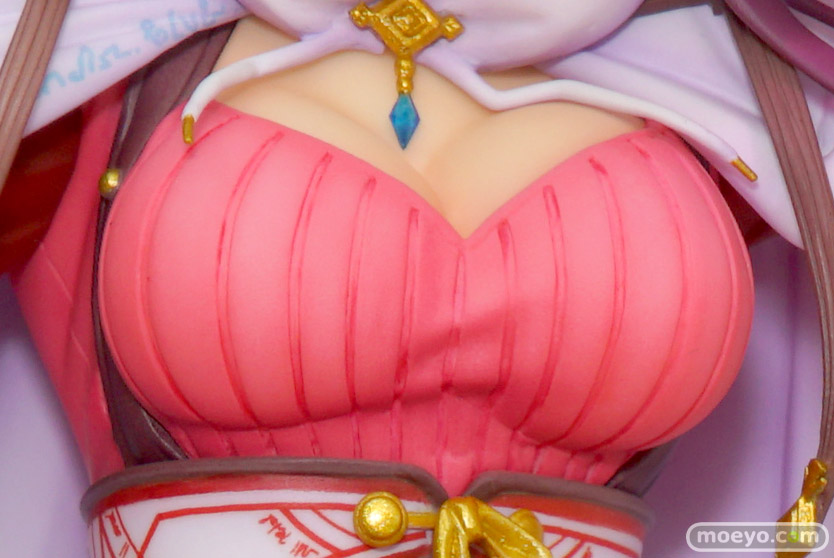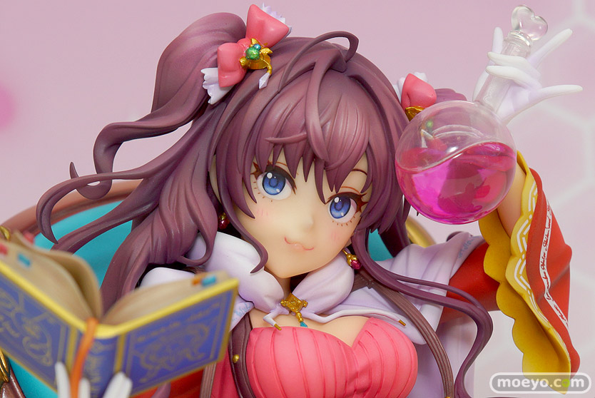 フラスコを片手に上目遣いで微笑む姿が可愛らしい仕上がりです。奔放な彼女らしく、宝箱に投げ出すように足をかけた仕草が魅力的。ゆったりと組んだ足は柔らかそうな肉感を感じさせます。衣装のベルトやアクセサリー、ファンタジックな模様なども細部まで再現。クリアパーツを使用したフラスコやレトロ感ある椅子も丁寧に造形され、鮮やかかつ深みのある彩色表現により幻想的な雰囲気溢れる出来栄えとなりました。
