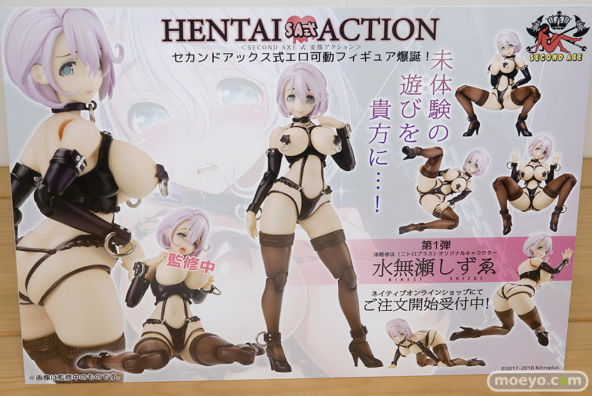 セカンドアックスの新作アダルトアクションフィギュア「SECOND AXE式❤HENTAI ACTION 水無瀬 しずゑ」が、2018年5月28日(月)19時までネイティブオンラインショップ限定で受注中です!『「すーぱーそに子」でお馴染みの人気イラストレーター津路参汰氏(ニトロプラス)の新作描き下ろし、旅館の若女将見習いでもある大和撫子「水無瀬しずゑ」が登場!さらに18禁に特化した可動ギミックを搭載する全身フル可動のアクションフィギュアとして立体化!』というもので、原型制作は木下貴雄(イクリエ)さん。その最新の彩色サンプルを見せて頂けましたので、画像レビューとしてお伝えします!(アダルトフィギュアとなります!18歳未満の方は閲覧をお控えください。)
