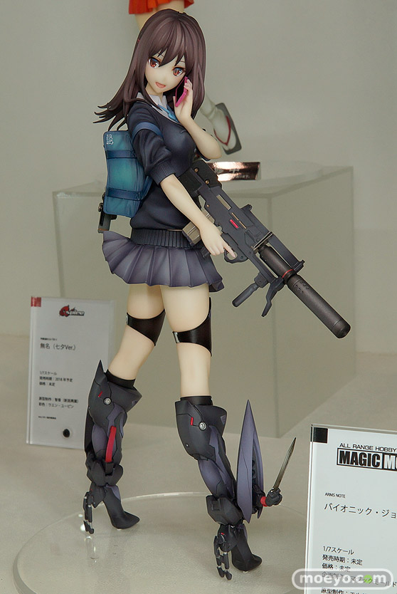 マジックモールドの新作フィギュア「ARMS NOTE バイオニック・ジョシコウセイ」がGOODSMILE ONLINE SHOP、あみあみ、Amazonでの限定販売アイテムとして予約受付開始!『「カワイイ」「美しい」「カッコイイ」!武装✕美少女フィギュアシリーズ第1弾。イラストレーター深井涼介が展開する「ARMS NOTE」より、「バイオニック・ジョシコウセイ」が1/7スケールで登場です。』というもので、製品版ではスカートが着脱可能!「ワンダーフェスティバル 2018[冬]」の会場で展示されていた彩色サンプルの様子を、画像レビューとしてお伝えします!