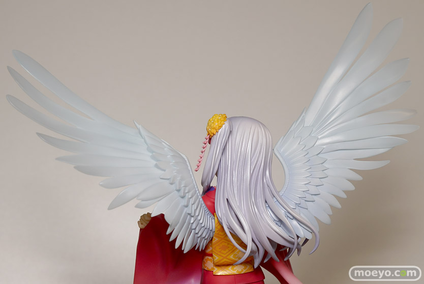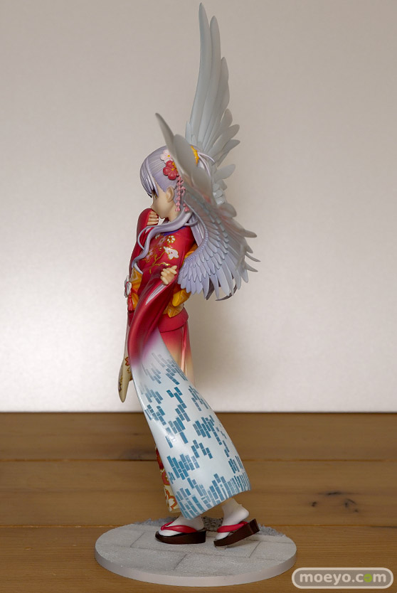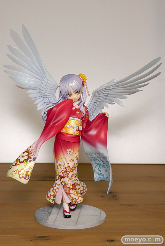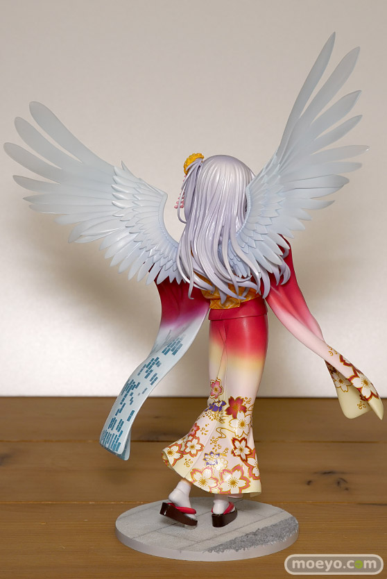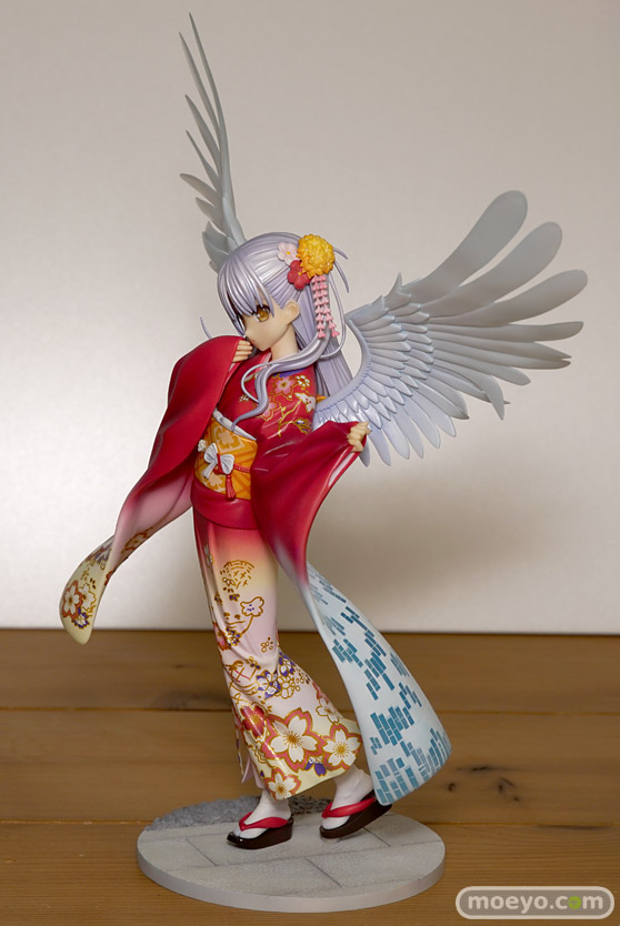 『Angel Beats!』のメインヒロインである「立華かなで」が晴れ着姿でスケールフィギュア化。キャラクター原案を担当されたNa-Ga氏の完全協力により、このフィギュアのために新規で描き下ろされたイラストをモチーフに立体化。鮮やかな朱色の着物は豪華な花々の刺繍で彩られ、恥ずかしげに口元を覆うかなでの様子を一層艶やかに再現しております。また、背面の大きな両翼や、左の振り袖は今まさに光の粒子で形成されていくかのようなイメージからクリアパーツを使用いたしました。まさに天使のようなかなでを是非お手元でお楽しみください。
