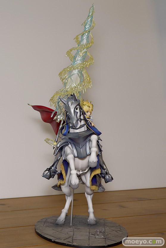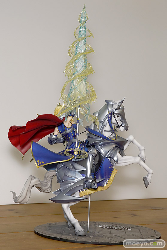 大人気スマホゲーム『Fate/Grand Order』より、ランサークラスのサーヴァント「アルトリア・ペンドラゴン」を、霊基第三段階の衣装でスケールフィギュア化。愛馬「ドゥン・スタリオン」に跨る姿は「騎士王」の名に恥じぬ雄々しさと、大人びた雰囲気を醸し出しており、今まさに宝具を放たんとする迫力ある姿を再現いたしました。大きくはためくマントの真紅、麗しい身体のラインが顕になった衣装の瑠璃、頑強かつ美しい流線型を描いた鎧の白銀、そして長大かつ緻密な造形で再現された宝具「最果てにて輝ける槍(ロンゴミニアド)」のクリア成型、造形と彩色が文字通り“人馬一体”となった圧倒的なボリュームとなっております。是非マスターのみなさんの元へお迎えください。