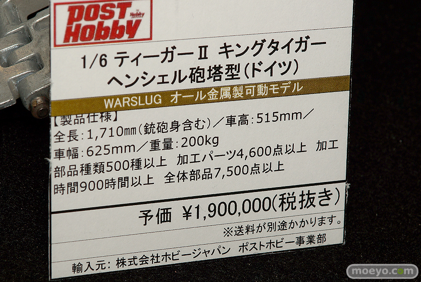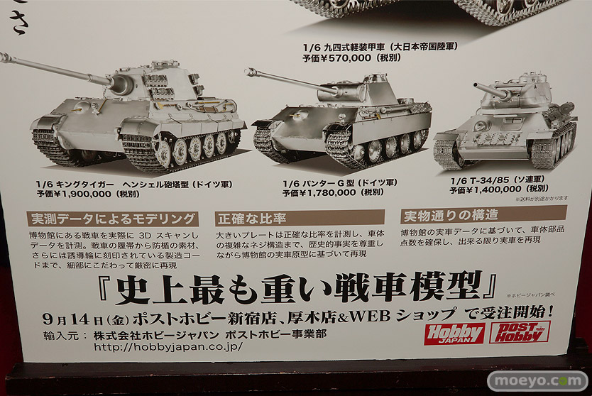 「C3AFA TOKYO 2018」で展示されていたフィギュア系新作レポート「千値練」「ホビージャパン」「造形工房密林」「メガハウス」編本日8月28日~8月26日の2日間、「C3AFA TOKYO 2018」が開催されます!その初日となる8月25日のメーカーブースで見かけた新作フィギュアやプラモデルの様子を、美少女フィギュアを中心に数回に分けてお伝えしていきます!こちらでは画像のオール金属製可動モデルでお値段税抜き190万円となる「1/6 ティーガーII キングタイガー ヘンシェル砲塔型(ドイツ)」などがあった「ホビージャパン」や「千値練」「造形工房密林」「メガハウス」の4ブース。